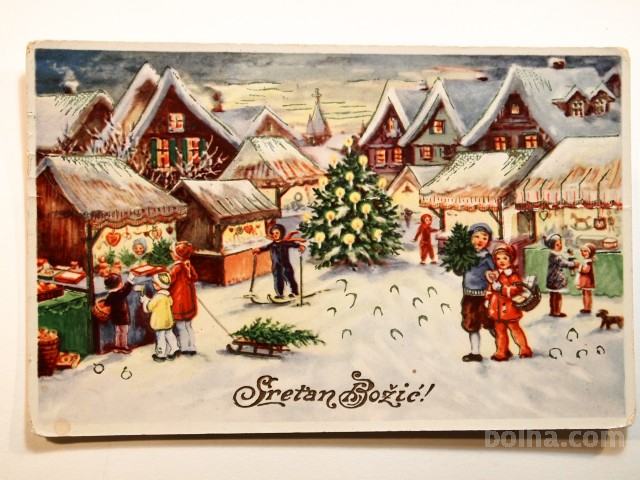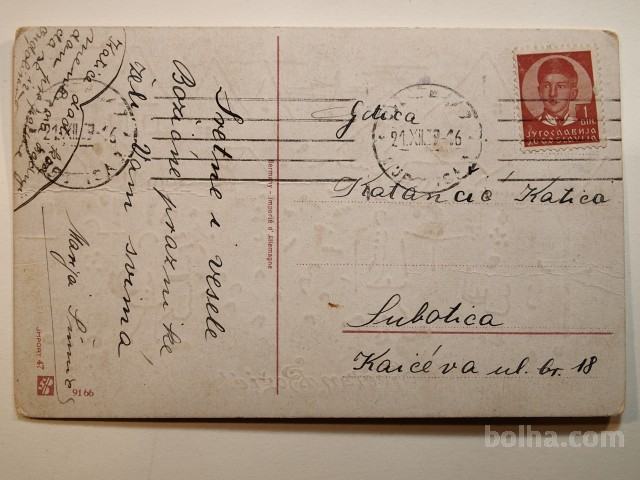 Razglednica SRETAN BOŽIČ, potovala 1939, z znamko in reliefno odtisnjenim napisom ter obrobami streh.