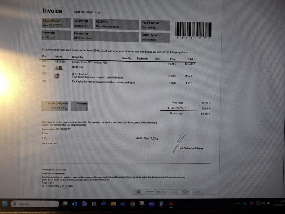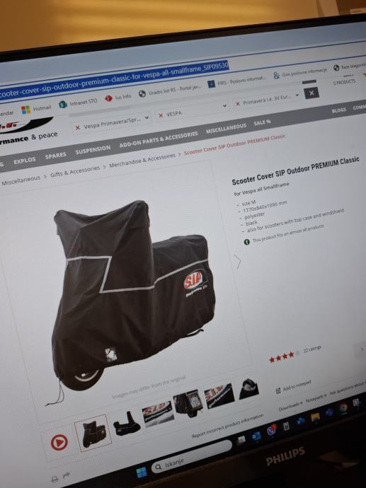 Prodam čisto novo Prevleko za skuter: Scooter Cover SIP Outdoor PREMIUM Classic, velikost M, 1770x840x1090 mm, also for scooters with top case and windshield, ART-NO.: SIP09530, saj je za moj motor premajhna. Končna cena je bila 68,26 EUR, dam jo za 10% popust torej: 60,00 EUR.