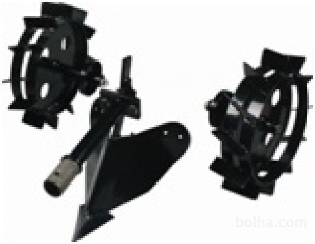 Plug z namenskimi kolesi, priključek za motokultivator. Širina pluga znaša 300 mm, premer koles 420 mm.