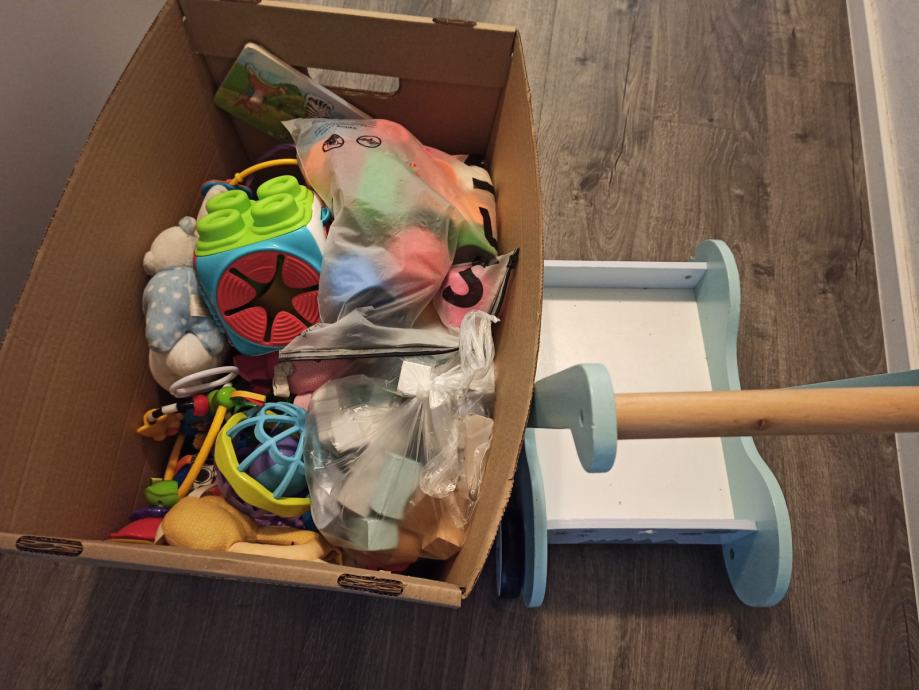 Prodam sprehajalček in igrače za dojenčka (nova glasbena podlogica, nova vtikanka, ropotuljice, mehke Clemmy kocke, itd..).