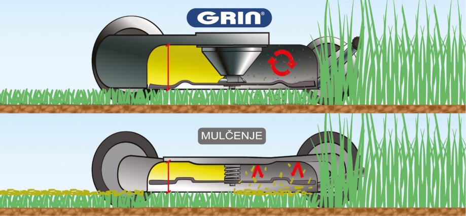 Z Grinom trave ni treba zbirati, skladiščiti in odlagati. Pokošena trava ostane v notranjosti patentirane kosišča Grin . Centrifugira se in zdrobi v prah, zahvaljujoč vrtincu, ki ga ustvari patentirano Grin rezilo v kombinaciji z učinkom Grin helix diska. Na ta način trava izgubi večino svoje prostornine in se zdrobi v majhne in skoraj nevidne delce . Ti delci padejo neposredno na tla (ne ostanejo na površini trate!) in se absorbirajo v zelo kratkem času. GRIN optimalno predela travo v notranjosti kosilne enote in jo zmelje v izjemno drobne delce, ki postanejo odlično gnojilo za vašo trato! V normalnih razmerah je trata videti identična tisti, ki jo pokosite s kosilnico z košem za travo. Vse kosilnice Grin so izdelane s posebnim okvirjem , ki je zasnovan izključno za to vrsto košnje.