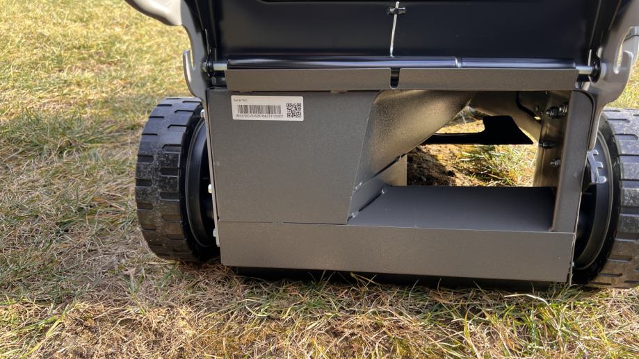 - zložljiv ročaj omogoča preprost, stoječ položaj za čiščenje (ročaj se prepogne naprej, kosilnica se dvigne in nasloni, da varno stoji vertikalno)