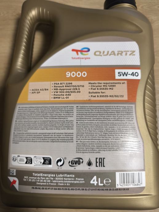 Prodam motorno olje Quartz 9000 5W-40 4l. Original zaprt, kupljen pred pol leta, račun.