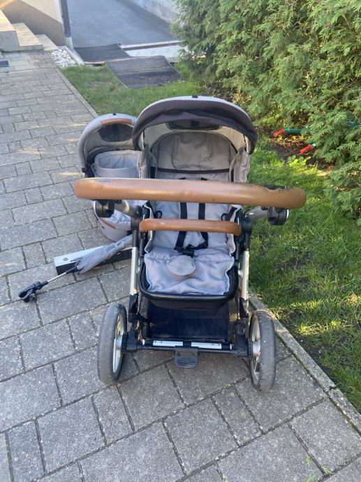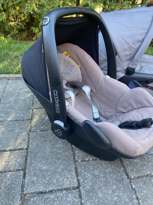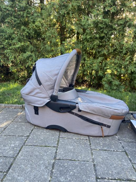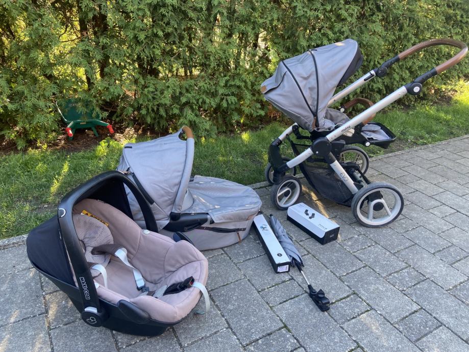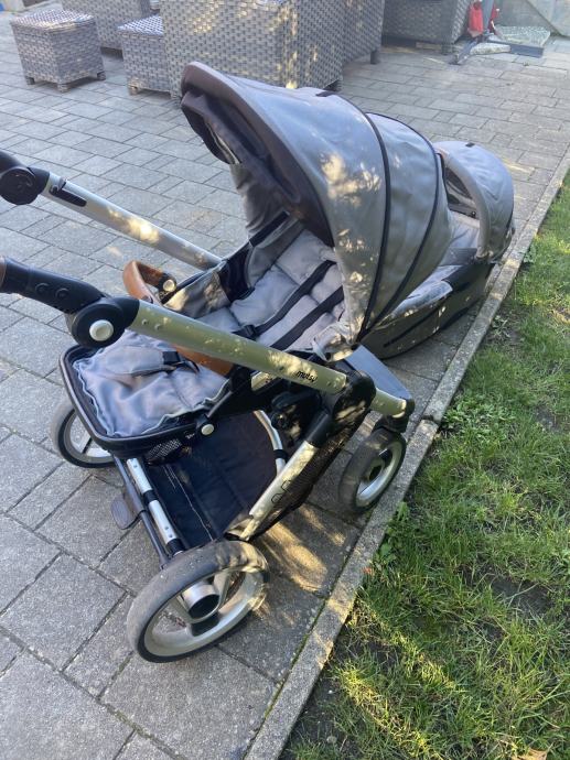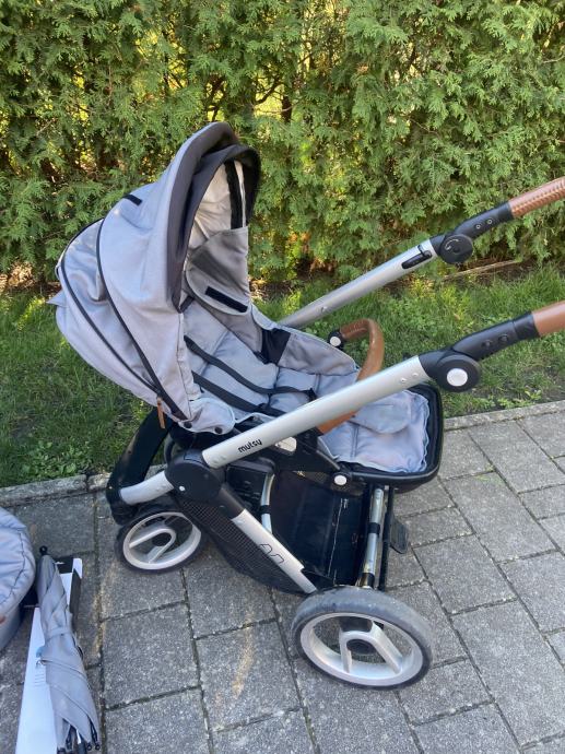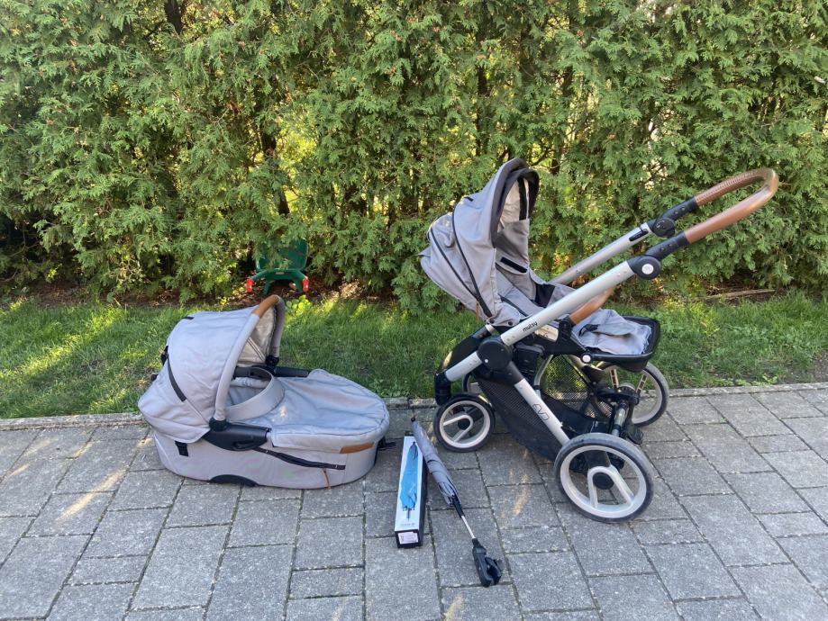 Prodam rabljen siv Mutsy Evo voziček košaro in športni del. Zraven priložim lupinico Maxi Cosi in original dežnik za voziček. Na obojem (vozičku in lupinico) so vidni znaki uporabe (na slikah), a je oboje še čisto funkcionalno in uporabno. Sicer je voziček zelo vodljiv in uporaben tudi za težje terene npr. makedam.