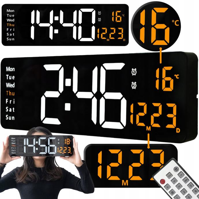 XXL LED elektronska budilka, dolga 39 cm, je izjemno velika in enostavno berljiva ura, idealna za uporabo doma, v pisarni ali telovadnici. Čas jasno prikazuje od daleč, priloženi daljinski upravljalnik pa omogoča enostavno upravljanje, ne da bi morali vstati. Lahko jo postavite na polico ali obesite na steno, saj združuje funkcionalnost s sodobnim dizajnom.
