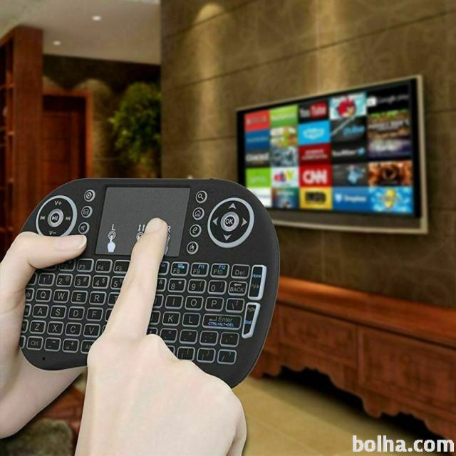 Mini brezžična tipkovnica se s svojo obliko lepo prilagaja roki in omogoča tudi upravljanje z eno samo roko. Naprava združuje QWERTY brezžično mini tipkovnico in sledilno ploščico TouchPad, ki ju z računalnikom, televizijo povežemo preko brezžičnega vmesnika USB. Računalnik mini tipkovnico prepozna samodejno, tako da nameščanje dodatnih gonilnikov ni potrebno. Naprava je idealna za predavatelje, vodje prodaje, predstavitelje in za vse domače uporabnike, saj omogoča brezžično uporabo v polmeru 10-ih metrov, kar vam bo olajšalo brskanje in uporabo vaših pametnih naprav (Smart TV-ji, računalniki, projktorji, itd…). Ta brezžični komplet pa je mogoče uporabiti tudi z napravo Android TV Box. Izdelek se ponaša tudi z inovativno funkcijo, kjer s pritiskom na tipko Fn in uporabo drsne plošče nadomestimo funkcijo koleščka miške. Za mnoge ljudi je to bolj priročna metoda za brskanje po spletnih straneh in urejanje dokumentov.