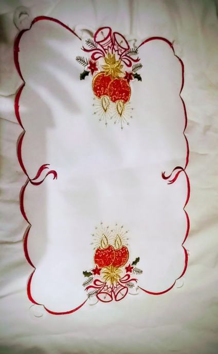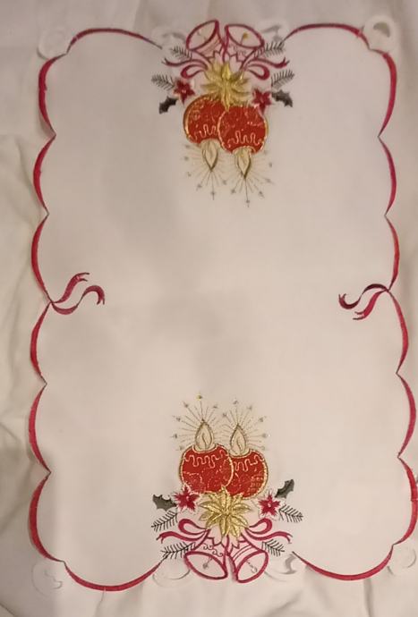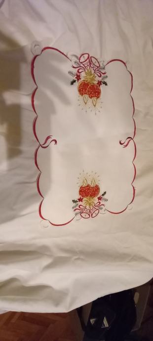 Prodajam dva povsem nova božična prtička z lepim prazničnim motivom in rdečim robom. Elegantna vezena okrasna prtička sta popolna za praznično pogrinjko in božično dekoracijo doma. Vel.39x40 cm.