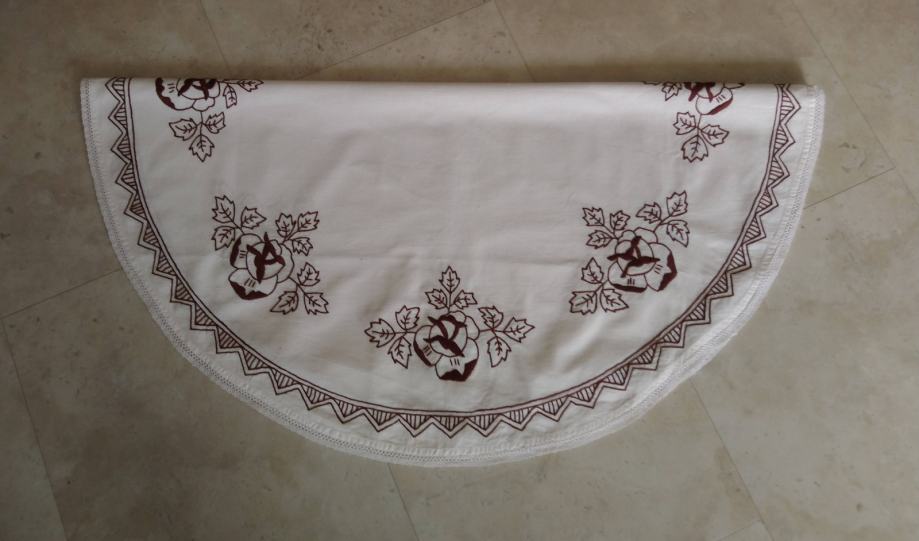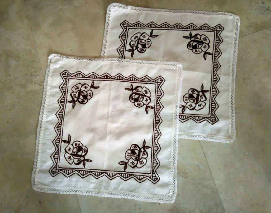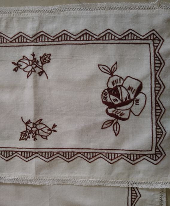 Komplet vsebuje 5 ročno vezenih prtičkov s čipko na robovih. Štikanje je rjave barve.