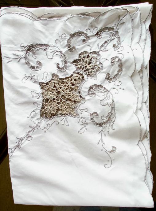 Zelo lep bel prt z bogato vezenino in kvačkanimi motivi v peščeni barvi, mere 164 x 117 cm, cena 25 EUR
