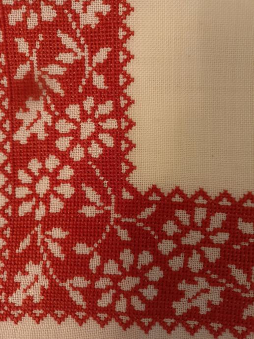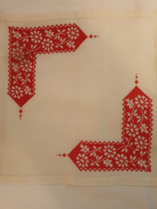 Velikost 50 x 50 cm, križci na blagu panama, ročno delo, lepo ohranjen. Prtiček nima nobenih madežev (če se na sliki vidi kakšen, je to od kamere mobija).