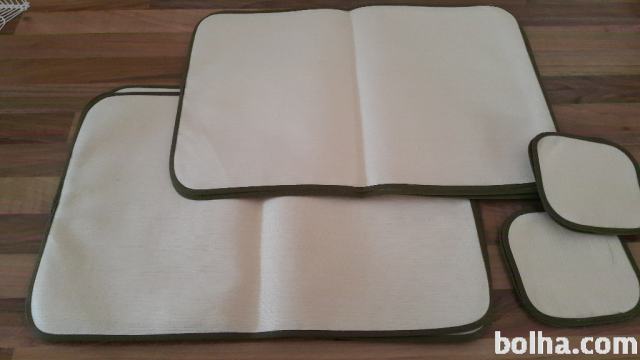 Nov pogrinjek iz bombaža in lanu v bež barvi z zeleno obrobo, sestavljen iz 6 pogrinjkov in 6 podstavkov za kozarec, prodam
