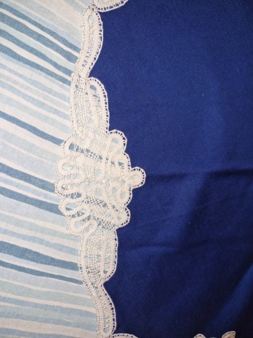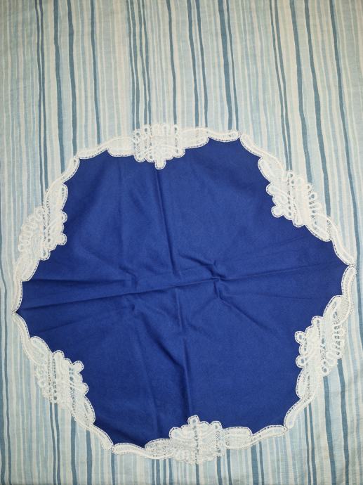Prodam okrogel prtiček modre barve z belo pravo čipko, premer cca 45cm