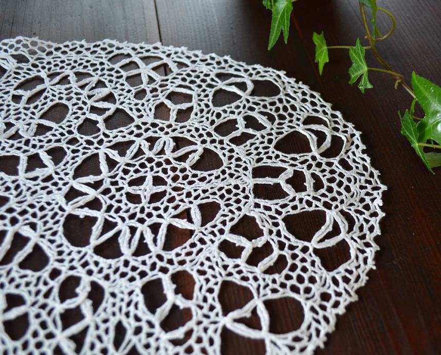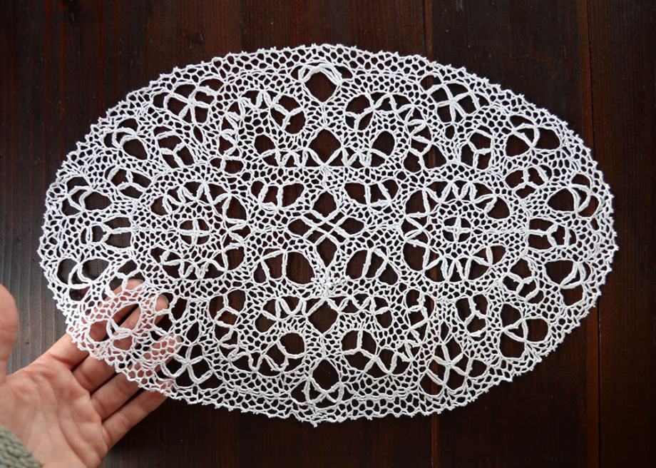Bombažni prtiček iz fine kvačkane čipke, ovalne oblike, bele barve, dimenzije 39 x 24 cm. Je starejše izdelave, a odlično ohranjen.