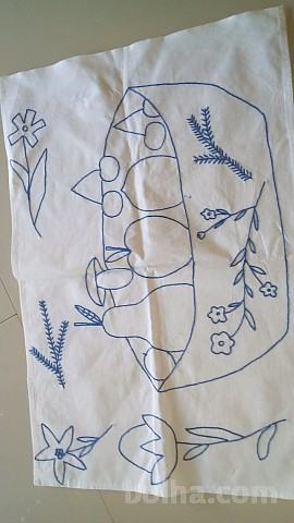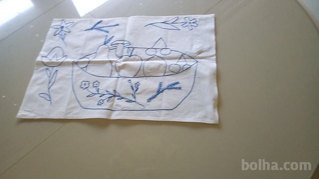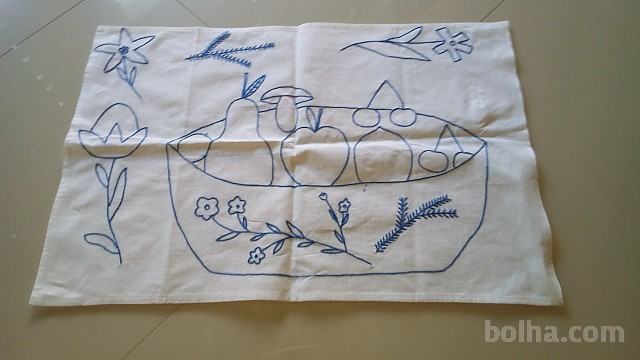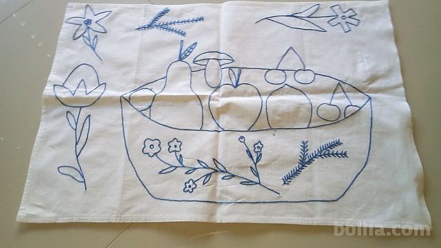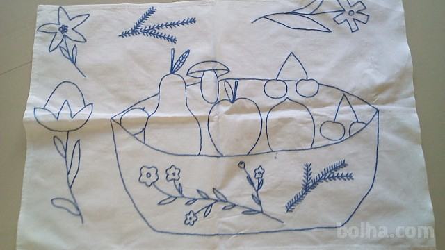 Prt -tihožitje . Štikan z modrim obrobjem. Sadje in pomladne cvetlice. Primeren za otroški kotiček v kuhinji. Mere: 49 cm x 33 cm Zelo malo rabljen in dobro ohranjen.