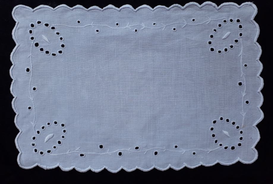 Vintage prtiček iz tankega belega platna, vezenje tehnika Richelieu s tanko svileno nitjo, letnik okoli 1900, dimenzije 30 cm x 20 cm, zelo lepo ohranjen.