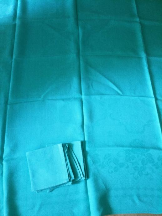 rumen prt za okroglo mizo R 170 cm, bombaž, še zapakiran. 15 eur in zelen lanen prt z vtisnjemim reliefom in šestimi prtički dimenzije 150 x 170 cm 30 eur