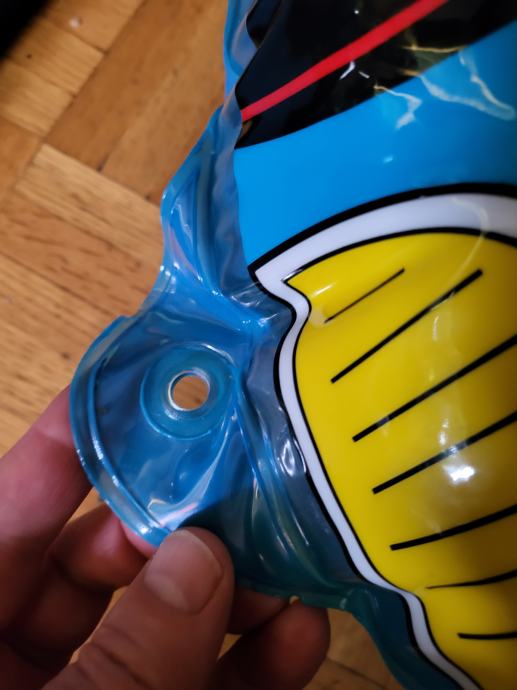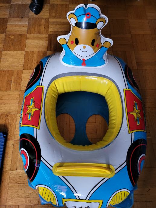 Srčkan napihljiv policijski avto z medvedkom policajem. Otrok se vsede in čofota z nogicami. Ročica za boljši oprijem ter odprtine za vlečno vrv. 60 x 50 cm. Rabljen nekaj krat, kot nov.