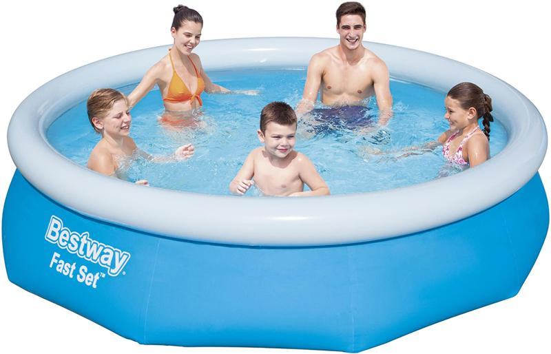 Bazen Bestway Fast Set v vročih poletnih dneh poskrbi za dobrodošlo ohladitev na lastnem vrtu. S premerom 305 cm in robustnim materialom zagotavlja največje veselje pri kopanju in se hitro postavi.Napihljiv vrtni bazenPlavalni bazen lahko hitro in preprosto postavite brez orodja. Preprosto napihnite zgornji zračni obroč in nato napolnite zunanji bazen. Med polnjenjem se okrogli bazen samostojno dvigne in lahko uživate v kopanju.Robusten in trpežen vrtni bazenMontažni bazen je širok 305 cm, visok 76 cm in ima kapaciteto vode 3.800 l pri 80-odstotni polnitvi. Stabilna in trpežna TriTech folija, odporna proti trganju poskrbi, da je bazen še posebej robusten. Ta 3-slojna tkanina iz PVC-ja je še posebej trpežna in odporna proti vremenskim vplivom, zato je še posebej trpežna.Praktičen komplet za bazenPraktičen izpustni ventil omogoča praznjenje bazena Quick Up. Priložena filtrirna črpalka (220 V-240 V) ima moč 1.249 l/h (približno 0,00035 m³/s). V kompletu so vključeni tudi ustrezni cevni priključki.