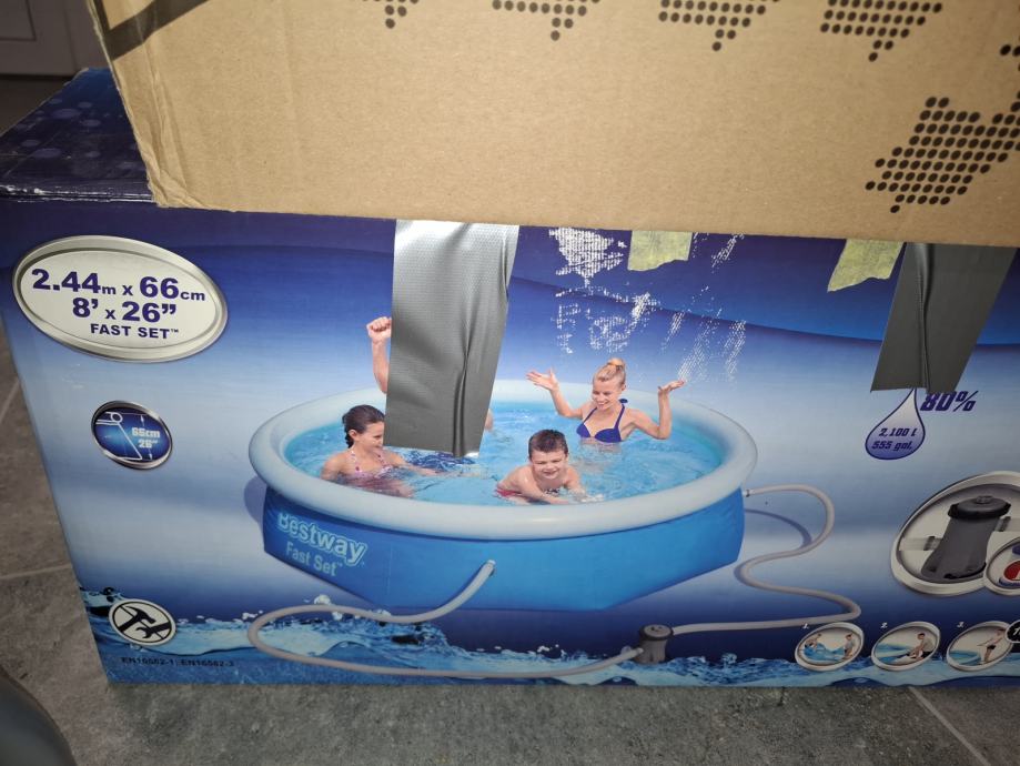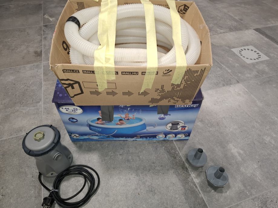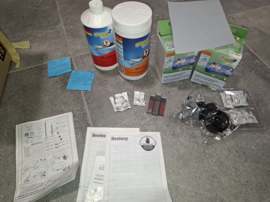 Prodam omenjen bazen. Je dobro ohranjen. Zraven so črpalka in vsi pripadajoči deli za kroženje vode. K kompletu dodam tudi sredstava za uravnavanje pH, klorove kocke in sredstvo kids care.