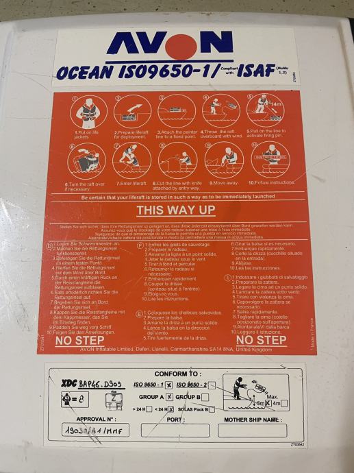 Prodam napihljiv rešilni splav Avon Ocean Liferaft ISO 9650-1, namenjen varni evakuaciji posadke v primeru izrednih razmer na morju. Izdelek ustreza standardu ISO 9650-1 (Type 1) in je primeren za plovbo na odprtem morju.