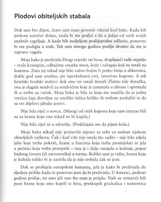 U očekivanju rođenja svog prvog djeteta, Foer je odlučio sebi predstaviti sve argumente za i protiv vegetarijanstva kako bi odlučio koji je najbolji način prehrane za njegovu bebu. Ono što je otkrio šokiralo je njega samoga, a šokirat će i svakog tko se upusti u čitanje ove knjige koja se čita poput najnapetijeg krimića.