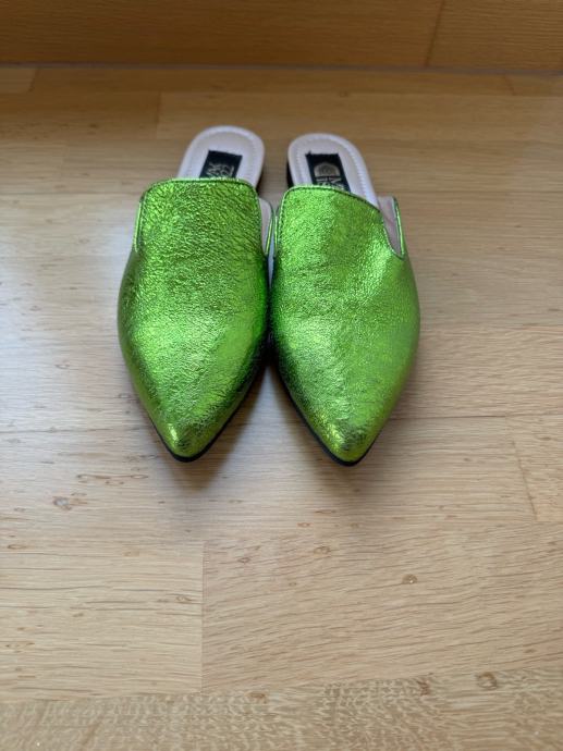 Novi usnjeni ženski natikači v živahni zeleni barvi, velikost 37. Natikači so elegantne oblike s koničastim sprednjim delom in udobnim podplatom. Idealni za poletne dni ali posebne priložnosti.