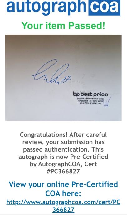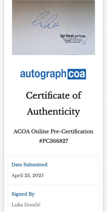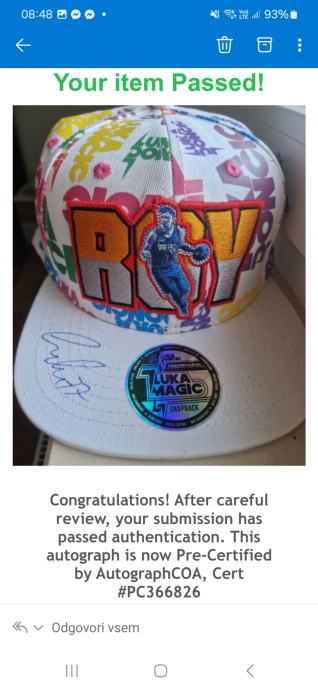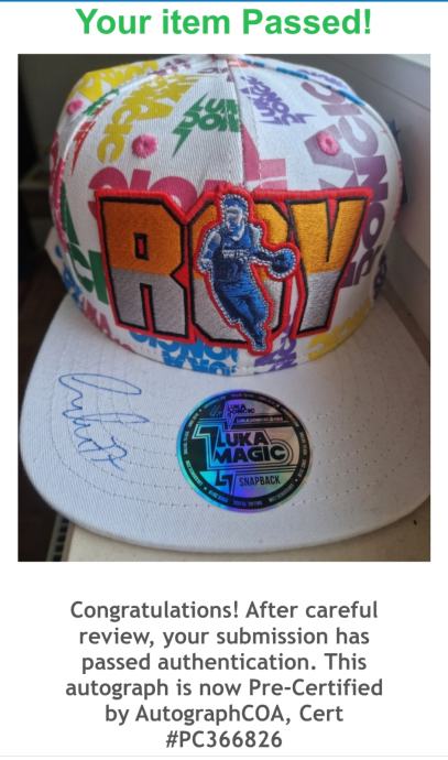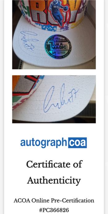 Prodam original podpisano kapo + certifikat Rookie of the year. Podpisano s strani Luka Dončič. Overjeno na strani : COA Autograpf. Kapa je bila v prodaji v omejeni seriji 4977 kosov. Priloženi vsi dokumenti.