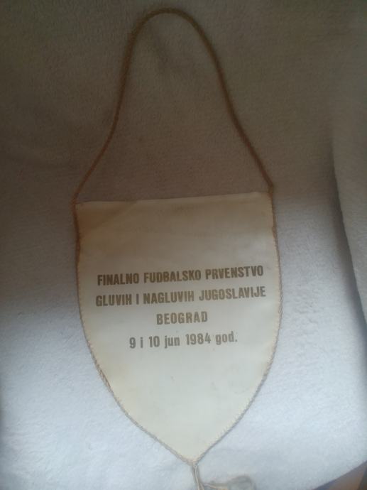Prodam vintage zastavico finala nogometnega prvenstva Jugoslavije za gluhe in naglušne, ki se je leta 1984 odvijalo v Beogradu. Ogled in prevzem Ljubljana Center. Cena 30 eur. Morebitno poštnino plača kupec. Pokličite 031 382828.