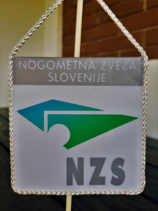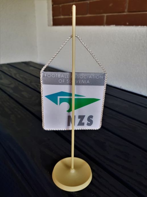 Zastavica Nogometna zveza Slovenije NZS. Dvostranska, SLO in ANGL, namizna oz. avtomobilska, dimenzije 10 x 10 cm, zelo dobro ohranjena, s podstavkom, za zbiratelje.