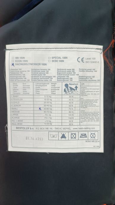 Rešilni jopič veličine S . Bil na čolnu eno sezono za varnost ampak je NERABLJEN.