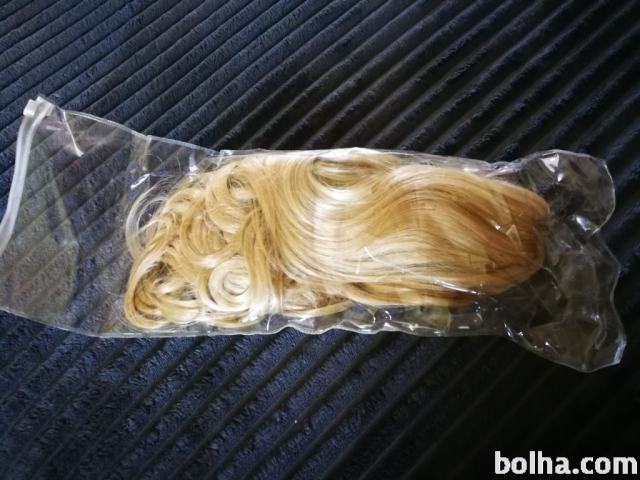Nikoli uporabljen umetni cop dolgih blond valovitih las, ki se pritrdi z vsito spango.