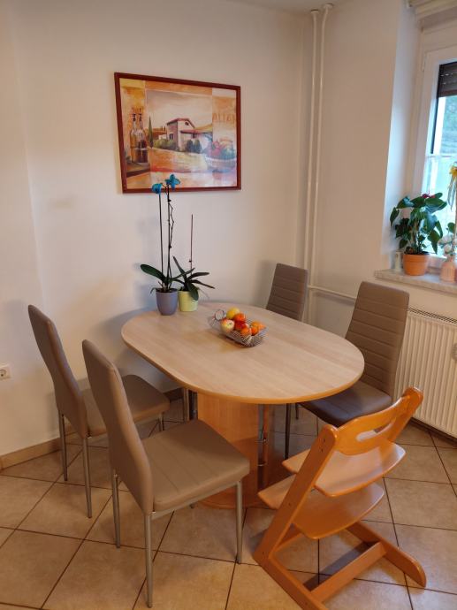• Polno opremljeno stanovanje: kuhinja, z pomivalnem strojem, pečico, steklokeramično ploščo, hladilnikom z zamrzovalno skrinjo, WC in kopalnica s pralnim in sušilnim strojem, spalnica z garderobnimi omarami, dnevni regal, sedežna z ležiščem, jedilna miza in stoli, omare…..