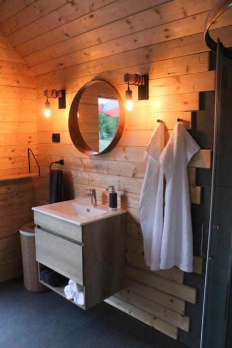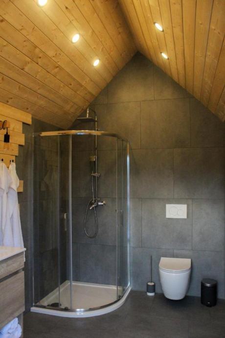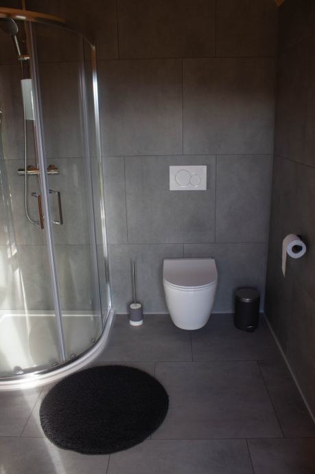 Površina kopalnice je 10m² bruto in 6m² neto + servisni prostor, ki je dostopen na zadnji strani skozi ločen vhod, kjer se nahaja elektro omarica, bojler za toplo vodo, lijak in pipa, odtoki, ventili za vodo, wi-fi ipd.