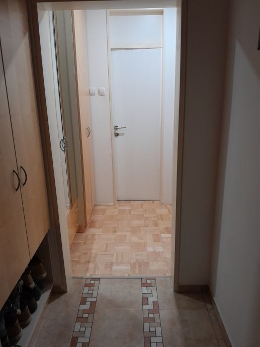 skozi vhodna vrata vstopamo v dolg hodnik ( 3,45 m2) in predprostor (3,05m2),v katerem so na levi strani vgradne omare,desno vstopamo v sobo (13,25m2).Iz hodnika naravnost vstopamo v pralnico (3,00m2),diagonalo desno skozi vrata v dnevni prostor (27,70m2),kateri je povezan s kuhinjo (6,80m2) in jedilnico, iz katere je izhod na balkon (2,20m2),od koder je lep razgled. Znotraj dnevnega prostora so stopnice,katere vodijo v zgornjo etažo v hodnik (2,25m2),kjer levo skozi vrata vstopamo v sobo(11,45m2),naravnost v shrambo z vgradnimi policami (1,80m2),naprej v kopalnico (4,65m2) in desno še eno sobo (8,60m2).