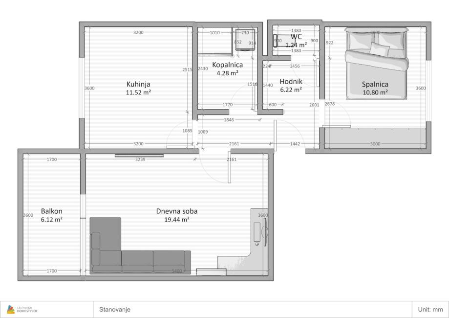 Površina stanovanja: 54,3 m² stanovanje + balkon 6,2 m² + shramba v kleti 1,2 m²