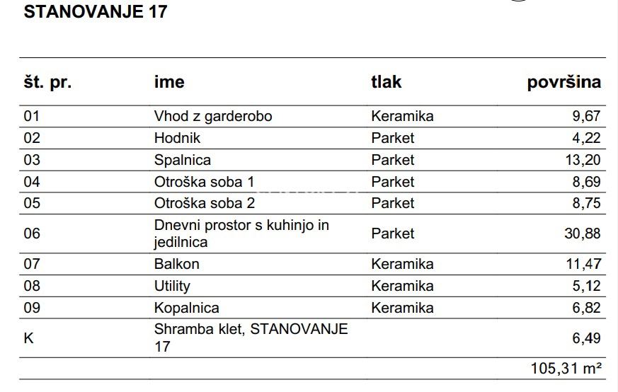 Predstavljamo vam 4- sobno stanovanje, v 2. nadstropju objekta v skupni velikosti 105,20 m2 (od tega je 6,49 m2 kleti in 11,47 m2 balkona). Razporeditev stanovanja je sledeča: hodnik, spalnica, otroška soba 1, otroška soba 2, kopalnica, dnevno bivalni prostor, vhod v garderobo, utility, balkon, shramba. Podrobnejši razpored prostorov in tloris je priložen med fotografijami oglasa.