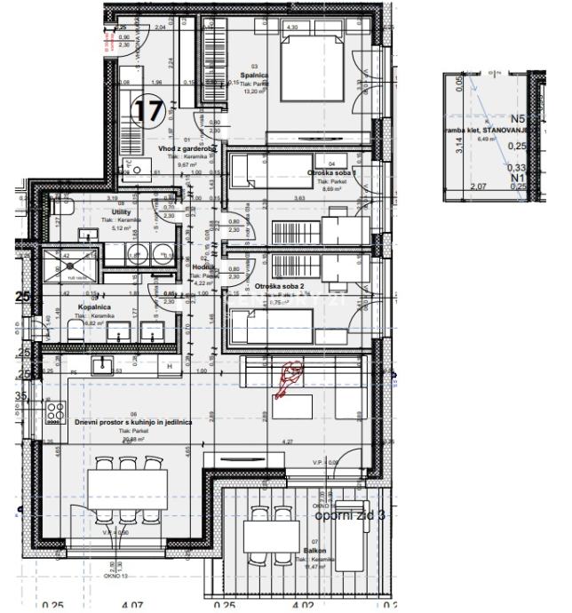 - v kopalnicah bodo vgrajeni: umivalnik, sanitarna školjka brez roba s pokrovom (kot npr. Villery Boch), tuš steklena stena in armatura pri umivalniku ter tušu.