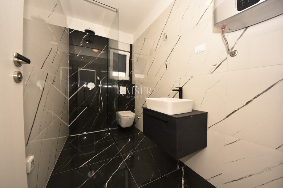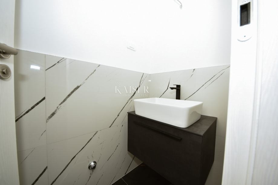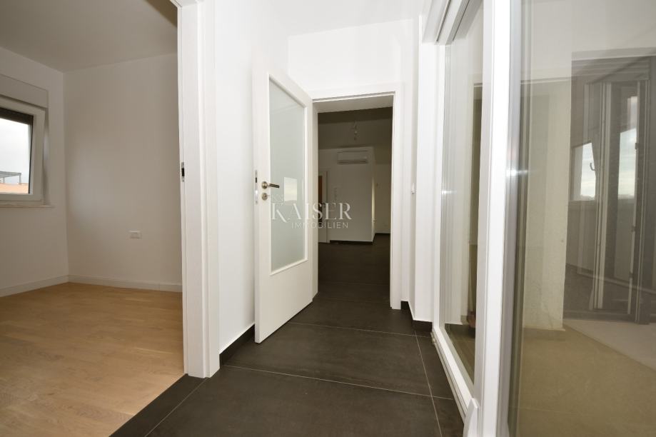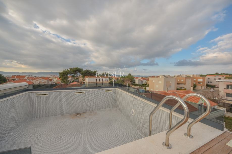 Kaiser immobilien posreduje pri prodaji luksuznega novozgrajenega penthouse stanovanja s strešno teraso in bazenom, na lepi lokaciji v Zadru. Stanovanje s skupno bivalno površino 110m2 se nahaja v 2. nadstropju novozgrajene stavbe in obsega dnevno sobo z dnevno sobo, kuhinjo in jedilnico, tri spalnice, kopalnico, wc, shrambo, dve pokriti loži, dva hodnika, stopnišče in hodnik za streho. Na strehi je terasa 79m2, kjer je tudi bazen s prostorom za sončenje, tušem in vrtnim kaminom. Terasa ponuja panoramski pogled na morje in mestno obzorje - popoln kraj za uživanje v poletnih večerih. Stanovanju pripadata dve označeni parkirni mesti. Pri gradnji in opremi so bili uporabljeni vrhunski materiali in oprema, tako da ima objekt vrhunsko pohištvo, talno gretje in klimatsko napravo v vseh prostorih. Provizija agencije za kupca znaša 3% + DDV in se plača v primeru nakupa nepremičnine ob sklenitvi prvega pravnega posla.