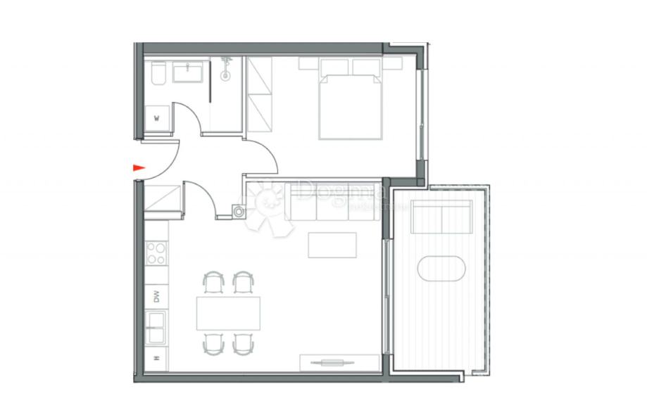 Sestoji iz predsobe, kopalnice, spalnice in prostorne dnevne sobe s kuhinjo in jedilnico.