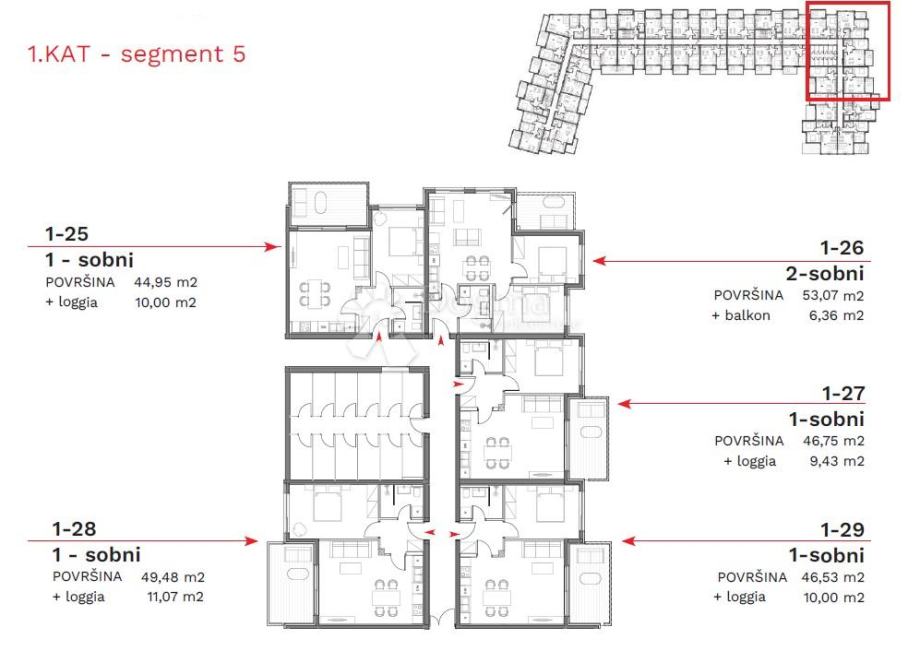 Prostorno stanovanje s skupno kvadraturo 56,53 m2 je vzhodno orientirano in se nahaja v 1. nadstropju.