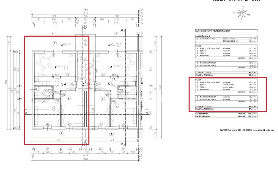 Sestavlja ga shramba v kleti, dnevna soba s kuhinjo in jedilnico, dve spalnici, kopalnica in dve pokriti terasi.