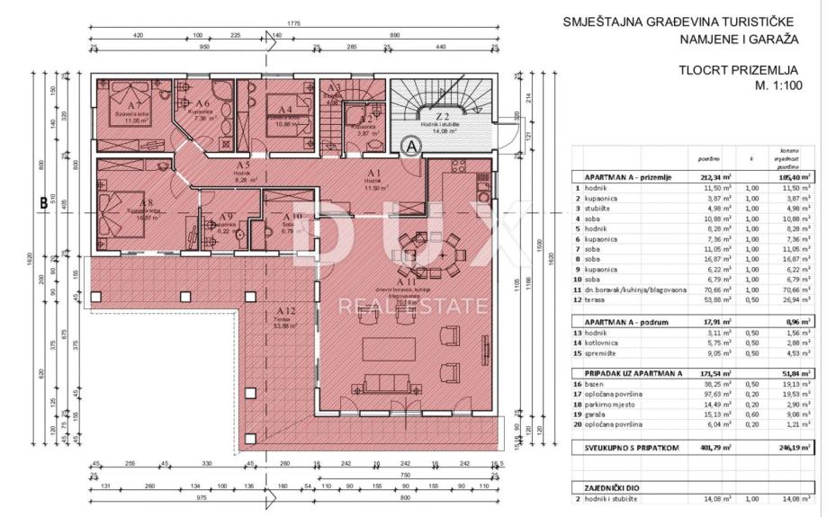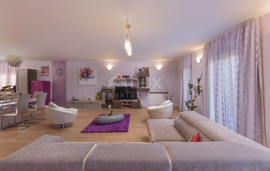 Luksuzno stanovanje v bližini Medulina - odlična izbira za udobno življenje ob morju! Ponujamo čudovito stanovanje, ki je pravkar prišlo na trg. Nahaja se v slikovitem okolju Medulina, to novozgrajeno stanovanje vam ponuja vse, o čemer ste vedno sanjali. To prostorno stanovanje obsega 246,19 m2 in se nahaja v pritličju stavbe, sestavljene iz skupno štirih stanovanjskih enot. Vaš novi dom ima vse, kar potrebujete za udobno in sodobno življenje. Poleg tega ima to stanovanje svoj bazen in vrt. Stanovanje v izmeri 185,40 m2 obsega prostorno dnevno sobo s kuhinjo in jedilnico, delovno sobo, tri spalnice, od katerih ima ena lastno kopalnico ter 2 dodatni kopalnici in shrambo. Stanovanje je polno svetlobe zahvaljujoč naravni svetlobi, ki prodira skozi velika okna. Posebej velja omeniti, da ima dnevna soba izhod na teraso, ki vodi do sončne ploščadi in bazena, kar vam zagotavlja dodaten prostor za sprostitev in rekreacijo na prostem. Stanovanju pripada še eno parkirno mesto (2,90 m2), garaža (9,08 m2) in shramba v kleti (4,53 m2), kar vam bo zagotovilo praktičnost in olajšalo vsakdanje življenje. Dodatno: - lasten bazen (5x8) - lastna kotlovnica v kleti - avtomatsko zalivanje okolja - talno ogrevanje s toplotno črpalko - ventilatorski konvektorji za ogrevanje in hlajenje Lokacija tega stanovanja je preprosto odlična. Le 200 metrov od morja boste lahko uživali v blagodatih plaže in se osvežili, kadar koli boste želeli. Okolica Medulina ponuja različne objekte, kot so restavracije, kavarne, trgovine in čudovito naravo za raziskovanje. Ne zamudite te edinstvene priložnosti!
