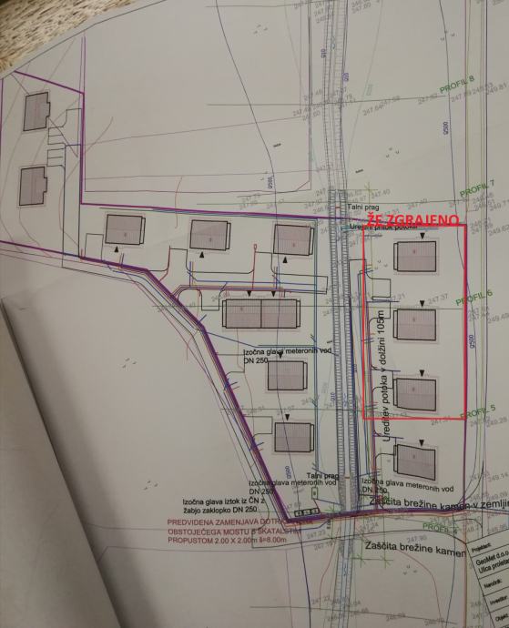 484/10 - 570 m2, stavba v tretji gradbeni fazi, v velikosti 125 m2, P+M, višina 7,7 m2, GD je pridobljeno, v teku 484/9 - 489 m2, stavba v tretji gradbeni fazi, v velikosti 124 m2, P+M, višina 7,9 m2, GD je pridobljeno, v teku 484/8 - 472 m2, stavba v tretji gradbeni fazi, v velikosti 125 m2, P+M, višina 7,7 m2, GD je pridobljeno, v teku 484/7 - 491 m2, pridobljeno GD, potrebno je podaljšati 484/18 - 183 m2, mišljena kot parcela za skupno čistilno napravo 484/17 - 460 m2, pridobljeno GD, potrebno je podaljšati 484/16 - 561 m2, pridobljeno GD, potrebno je podaljšati 484/15 - 370 m2, pridobljeno GD kot del dvojčka s sosednjo parcelo, potrebno je podaljšati 484/14 - 341 m2, pridobljeno GD kot del dvojčka s sosednjo parcelo, potrebno je podaljšati 484/11 - 394 m2, pridobljeno GD, potrebno je podaljšati 484/12 - 436 m2, pridobljeno GD, potrebno je podaljšati 484/13 - 458 m2, pridobljeno GD, potrebno je podaljšati 484/19 - 1. 566 m2, idejni načrt za 2 večji hiši, treba je razdeliti parcelo na 2 dela.