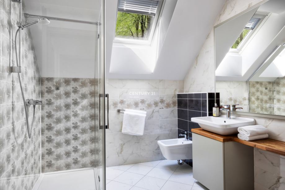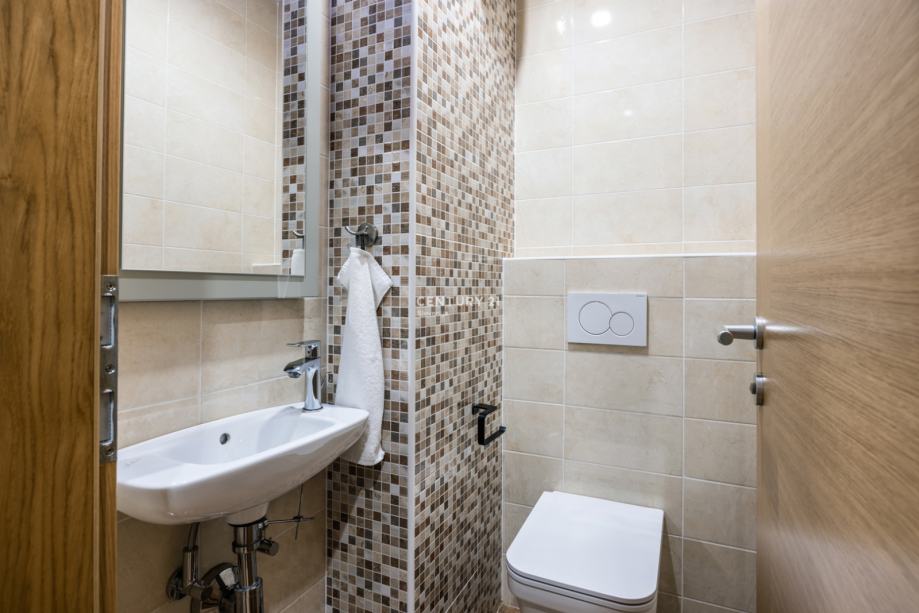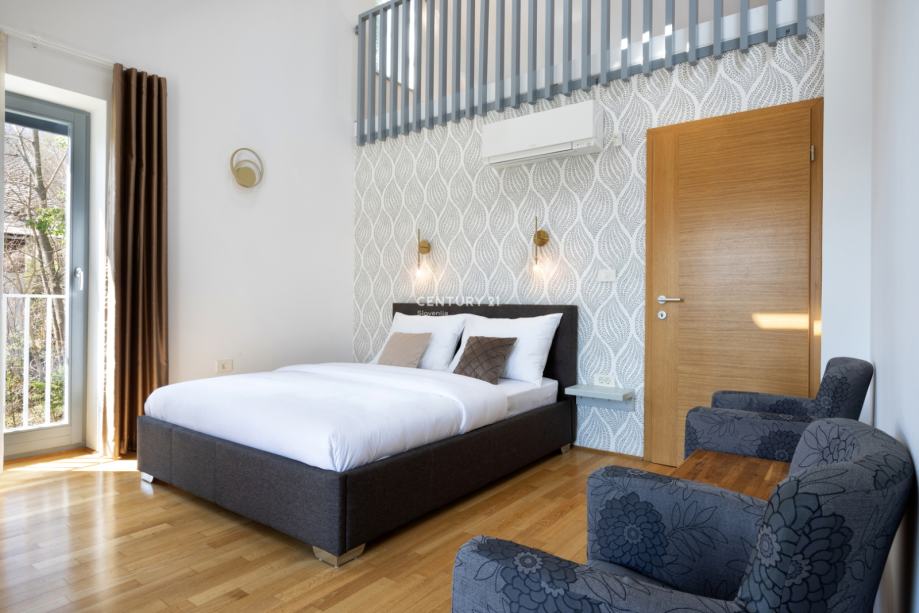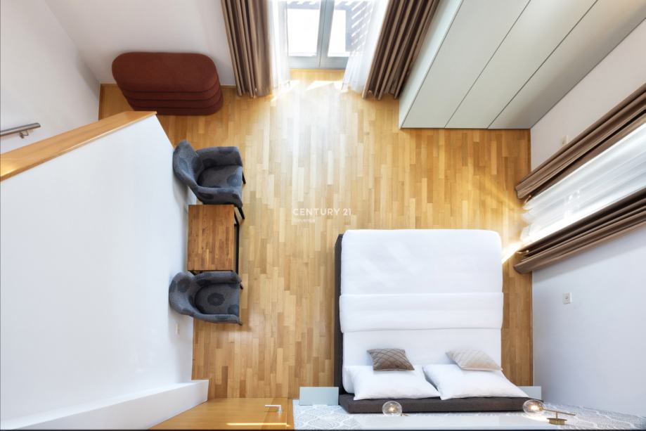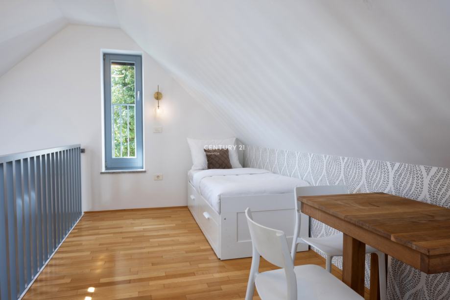 V prvi etaži vas pričakuje studio z zakonsko posteljo, ki vključuje sobo z infrardečo savno, moderno kopalnico z veliko tuš kabino, WC-jem in pralnim strojem, utility ter prostorno teraso.