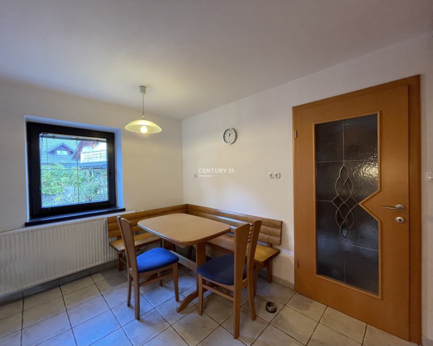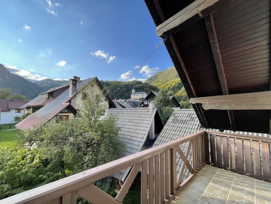Nadstropje (90 m2): prostorna dnevna soba z jedilnim kotom in kuhinjsko nišo ter izhodom na balkon z zahodno lego in čudovitim razgledom na Rudnico, Studor in bohinjsko dolino. Poleg tega vključuje dve spalnici s skupnim balkonom, kabinet z izhodom na ločen balkon, kopalnico s tušem in hodnik. Skupna površina balkonov znaša 23 m2.