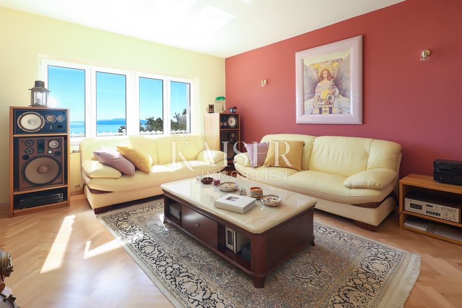 Kaiser Immobilien predstavlja čudovito družinsko vilo, ki se nahaja neposredno nad Opatijo in ima čudovit panoramski pogled na celoten Kvarnerski zaliv.Zgrajena je bila leta 2001 z najkvalitetnejšimi gradbenimi materiali. Ima cca 380 m2 bivalne površine, ki se razprostira v 3 etažah. V pritličju se nahaja prostoren pisarniški prostor, letna kuhinja, parna kopel in loža. Na željo kupca se to nadstropje lahko preuredi v samostojno stanovanjsko enoto. V prvem nadstropju je velika dnevna soba s kaminom, kuhinja in jedilnica. V tem nadstropju je tudi WC za goste, shramba in ena spalnica s kopalnico. v drugem nadstropju sta 2 spalnici, vsaka s svojo kopalnico, od katerih je ena opremljena s tušem, druga pa z masažno kadjo Whirlpool. V tem nadstropju sta knjižnica in garderobna omara iz masivnega hrastovega lesa. Tlaki v dnevni sobi, kuhinji in kopalnici so iz najkvalitetnejše španske in italijanske keramike. Vsi keramični tlaki imajo dodatno talno gretje.Stopnice so obložene z granitom in kovano ograjo. Ogrevanje je centralno na kurilno olje. Vila ima na strehi sončne kolektorje za ogrevanje sanitarne vode. Z Whirpoolom, parno kopeljo Hosch, najsodobnejšimi kuhinjskimi aparati Gagenau, sobnimi vrati iz masivnega hrasta ter vgradnimi omarami in ostalo visokokakovostno opremo so izpolnjene vse zahteve sodobnega stanovanja. Dvorišče je lepo vzdrževano, za hišo pa se nahajajo parkirna mesta. Iz vile, iz vseh dnevnih prostorov in spalnic, je čudovit pogled na Opatijo, reko, morje in otoke.