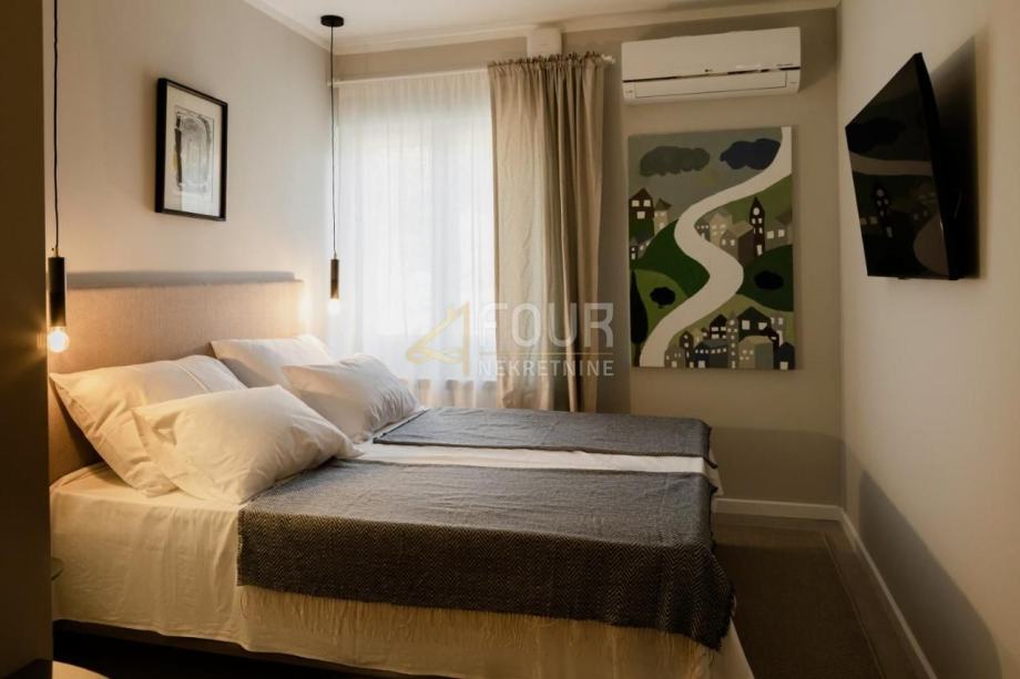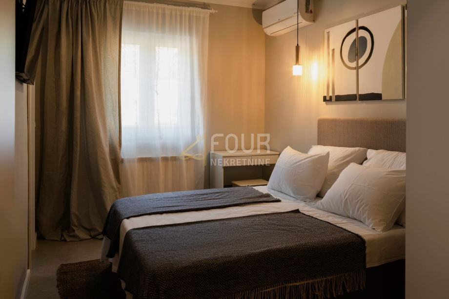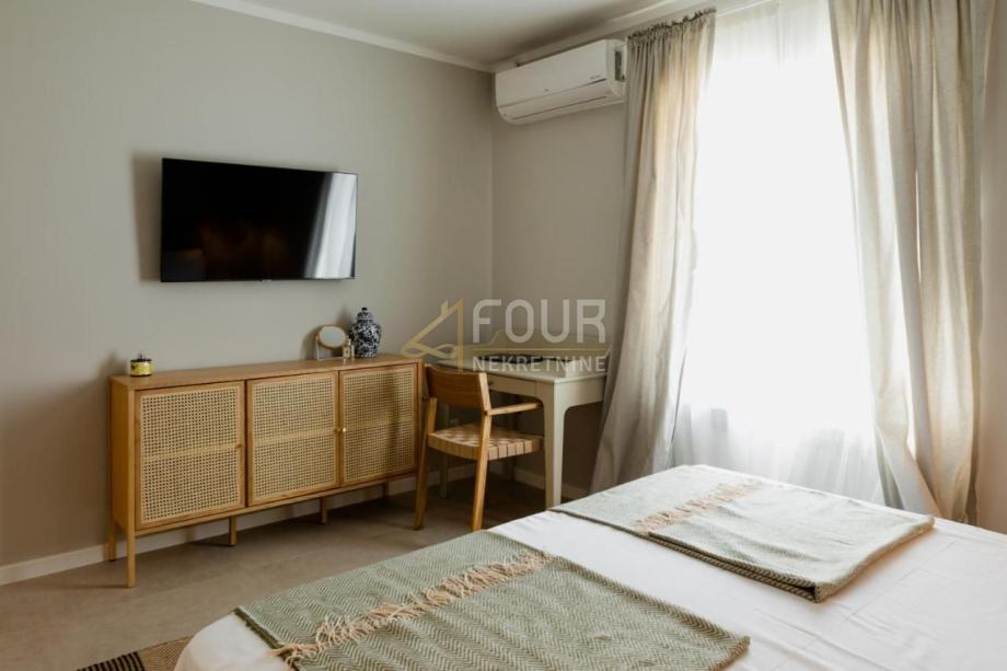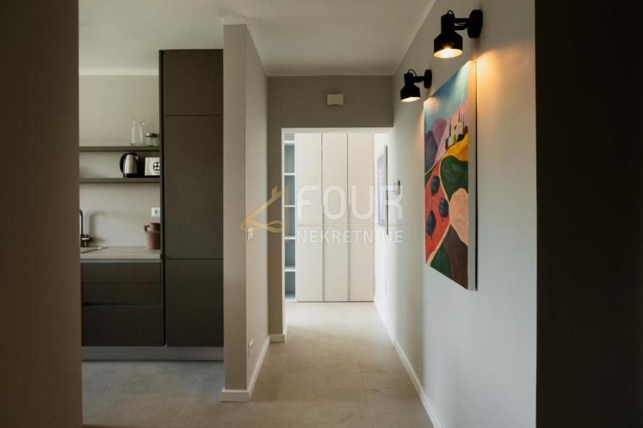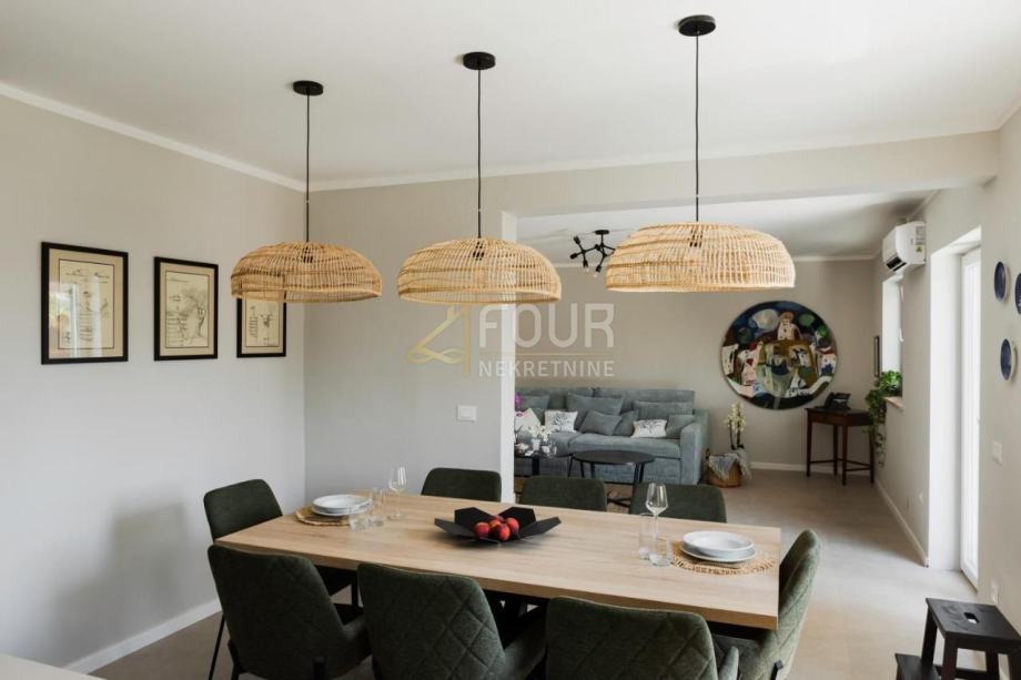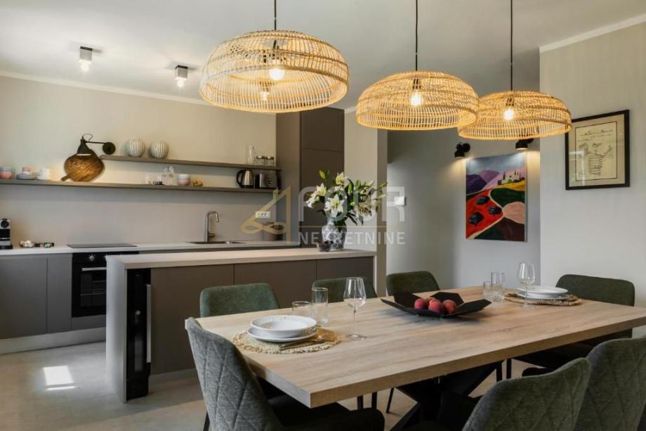 Sestoji iz kuhinje z jedilnico in dnevne sobe v odprtem prostoru z izhodom na izjemno prostorno teraso 100m2, hodnika, WC-ja za goste in treh spalnic z lastnimi kopalnicami.