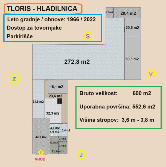 Na odlični in s tovornjaki dostopni lokaciji v Celju imamo v pritličnem poslovnem objektu na Delavski ulici na voljo za najem urejen kombiniran prostor - hladilnico s pisarnami, v skupni bruto velikosti 600 m2 (552,6 m2 uporabne površine). Z novimi avtomatskimi dvižnimi vrati je za dostavo in odvoz blaga urejen dostop za tovorna vozila, pred objektom pa je zagotovljeno parkirišče za osebne avtomobile. Pripadajoč sorazmeren delež zemljišča pred objektom znaša 260 m2. Objekt je bil zgrajen leta 1966 in ima betonsko gradnjo. Višina stropov znaša 3,6 - 3,8 metra. Predelne stene v pisarniškem delu so iz knaufa (možnost preureditve). Notranjost je bila v celoti obnovljena leta 2022, tako da je prostor pripravljen za namensko koriščenje kot hladilnica s hladilniškimi panelnimi stenami debeline 10 - 15 cm (plus režim), sicer pa se lahko koristi tudi kot navadno skladišče s pisarnami in obnovljenimi sanitarijami (M/Ž). Okna so bila prav tako zamenjana (dvoslojna, pvc, termopan). Narejeni so bili novi epoksi tlaki ter zamenjana električna napeljava. V pisarniških prostorih je internetni priključek. Objekt je priključen na javno elektriko, vodovod ter mestno kanalizacijo. Opcija: Pripravljene so odprtine za prezračevanje (manjka hladilniški sistem). Glede na potrebe najemojemalca je strošek investicije ureditve ustreznega hlajenja na strani najemodajalca. Ogrevanje dveh pisarn, hodnika in toaletnih prostorov bo urejeno z ustrezno klimatsko napravo (strošek najemodajalca), alternativno je možno urediti ogrevanje tudi na mestni plin. Objekt ima urejeno ustrezno varovanje varnostne službe. Pogoj najemodajalca za sklenitev posla: - Plačilo mesečne najemnine 5.500 eur; - Minimalna doba najema 5 let z možnostjo podaljšanja; - Najemna pogodba se sklepa v notarskem zapisu z deljenim plačilom; - Znesek varščine znaša: 1 x najemnina; - Najemnik prevzame plačilo dela dogovorjene provizije v enkratnem znesku 500 eur + 22 % ddv; - V najemnino niso vključeni tekoči stroški, ki jih prevzame najemnik (elektrika, voda-kanalizacija, internet, telefonija, stavbno zemljišče ter morebitni in strošek zavarovanja objekta). Video: https://youtu.be/EJINWAG66Ts Ogledi so možni po predhodni najavi. Vljudno vabljeni !