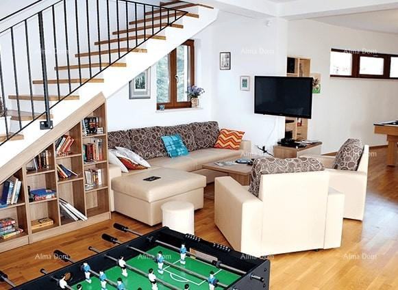 Hiša (400m2) se nahaja v čudovitem gozdnem okolju, tako da v bližini najdete številne možnosti za sprehode ali pohode ali vožnje s kolesom po najbolj očarljivi okolici. Celotno posestvo (2350 m2) je ograjeno, tako da se lastniki počutijo varne in uživajo v svoji zasebnosti, otroci pa se lahko prosto igrajo. Notranjost hiše je moderna in opremljena s kvalitetnim pohištvom s prijetnimi detajli. Kamin ter miza za biljard in nogomet v prostorni dnevni sobi prispevata k prijetnemu vzdušju.