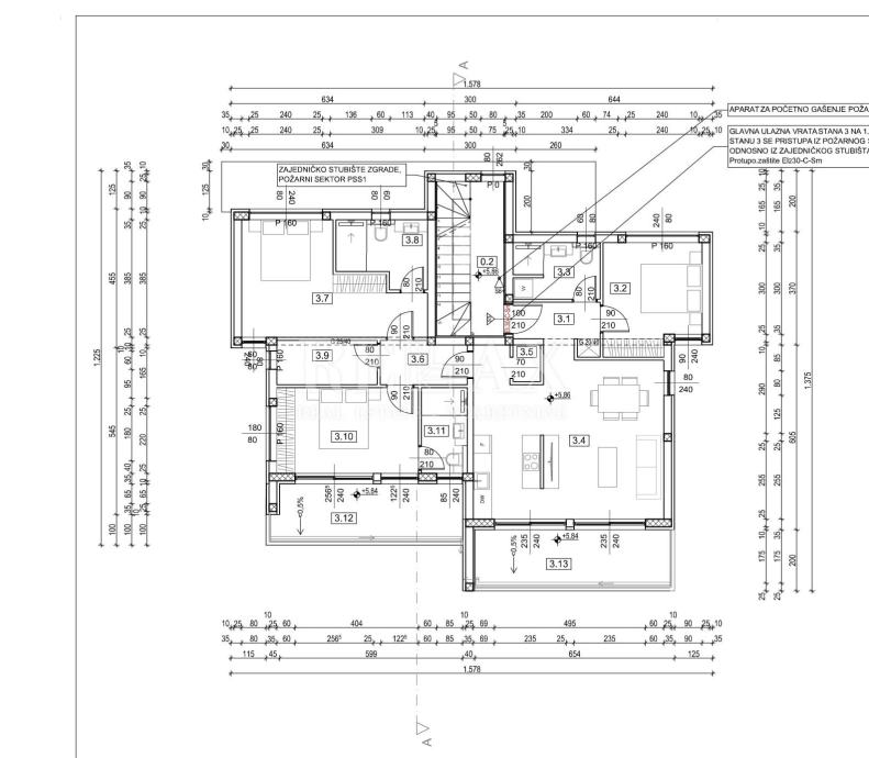 Stanovanje obsega tri spalnice, tri kopalnice, prostorno dnevno sobo povezano s kuhinjo in jedilnico, hodnik ter dva pokrita balkona, s katerih se razprostira odprt pogled na morje. Južna usmerjenost zagotavlja obilico sončne svetlobe skozi ves dan.